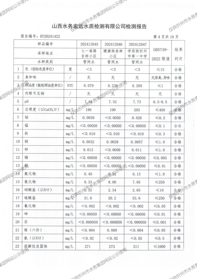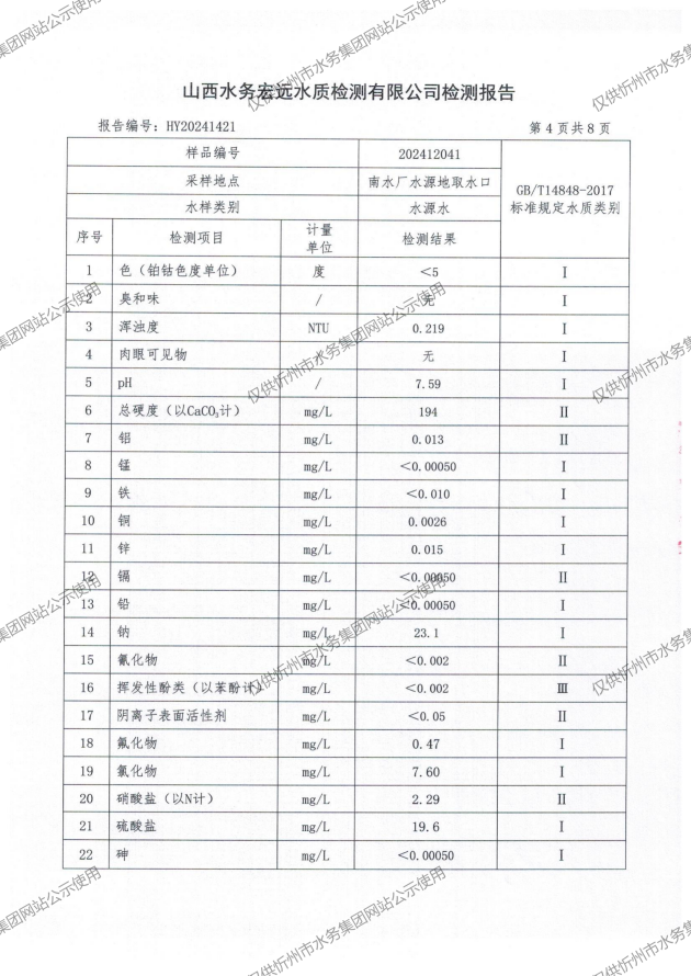 忻州城區(qū)公共供水水源水、出廠水、管網(wǎng)水、管網(wǎng)末梢水2024年12月份水質信息公示