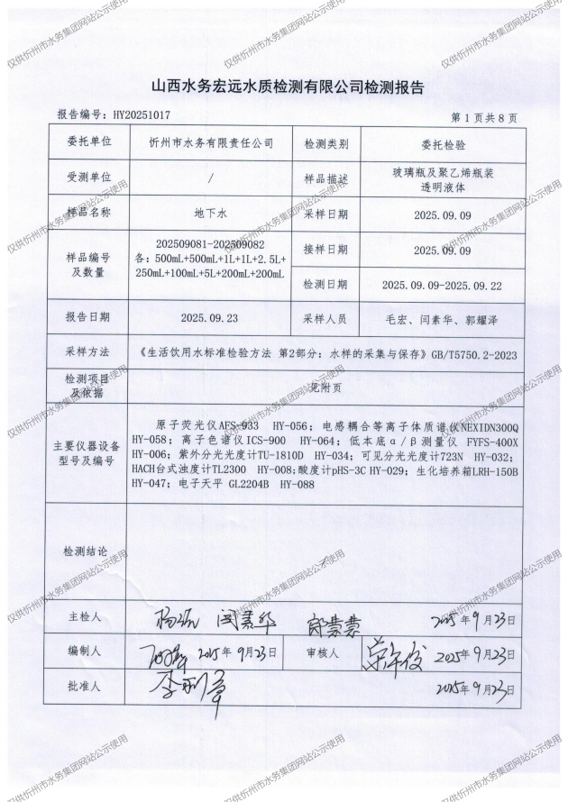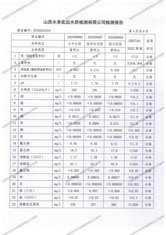 忻州城區(qū)公共供水水源水、出廠水、管網(wǎng)水、管網(wǎng)末梢水2025年9月份水質(zhì)信息公示