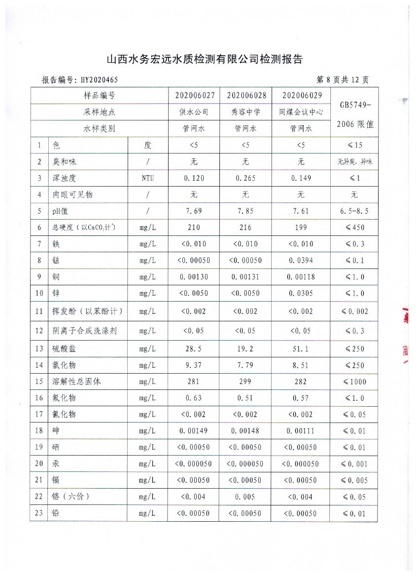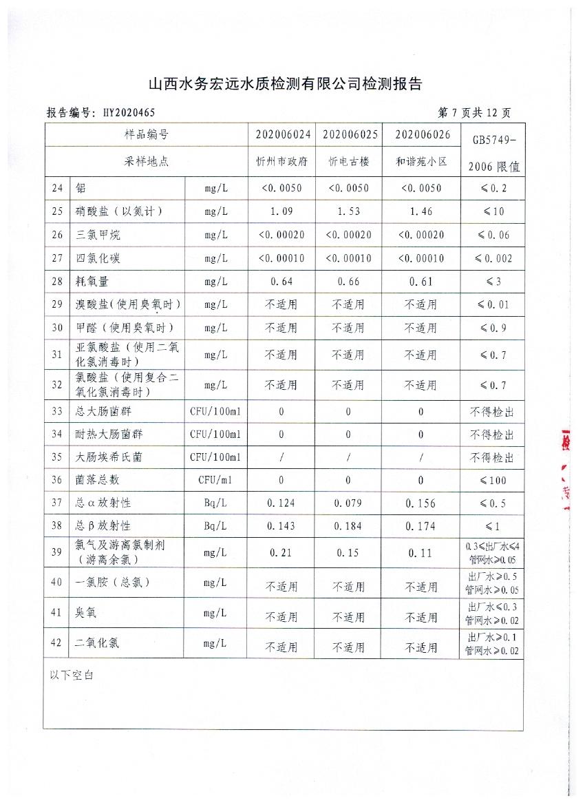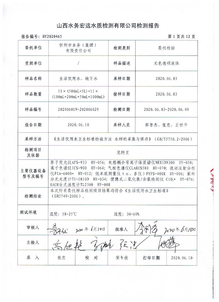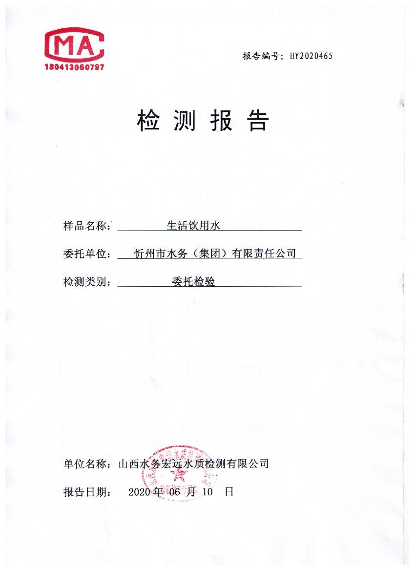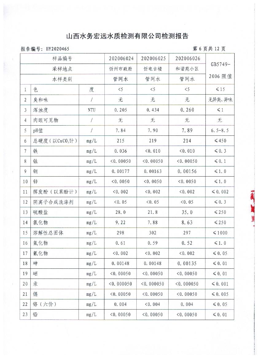 忻州城區(qū)公共供水水源水、出廠水、管網(wǎng)水、管網(wǎng)末梢水2020年6月份水質(zhì)信息公示