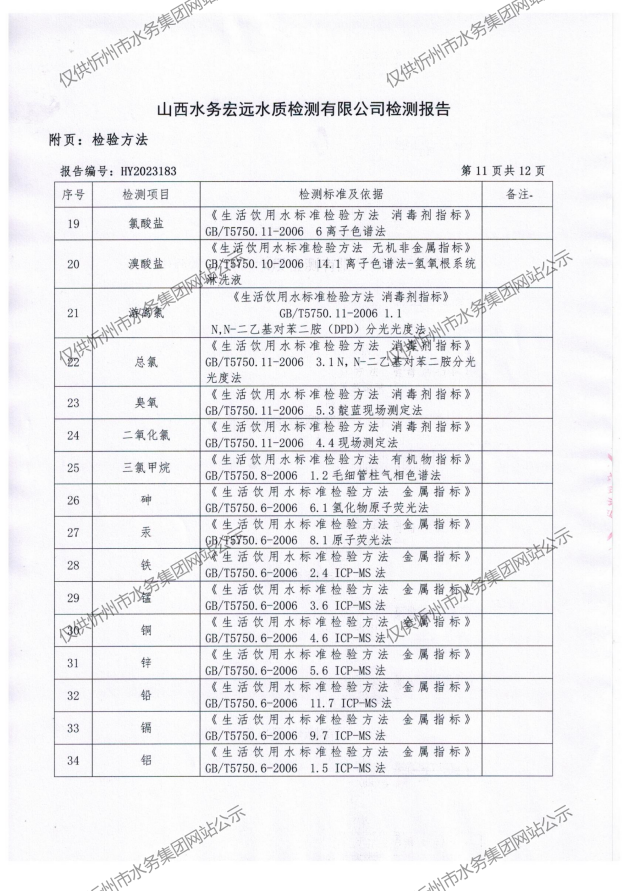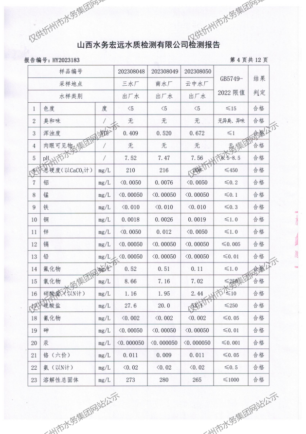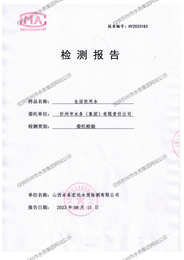 忻州城區(qū)公共供水水源水、出廠水、管網(wǎng)水、管網(wǎng)末梢水2023年8月份水質信息公示
